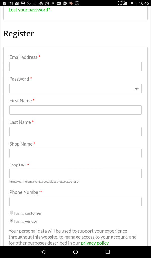 Put your details on the second form and register as a vendor. Put your correct email address because orders will be send using that email. You can name your shop using an unique name you may think of, for example VEGETABLE BASKET